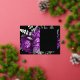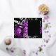 This elegant, moody wedding Save the Date card features a lush, romantic floral bouquet in plum purple with silver faux foil and glitter foliage on a black background. Customise the silver grey and plum text in stylish fonts on a black rectangle, and add your wedding website URL to the solid black back.