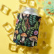 Mushroomcore artwork features forest flora and fungi in a pattern style against a black background. Flower blooms, ferns, toadstool mushrooms, and more in shades of green, brown, orange, pink, and purple, overall on the warmer side. Dark cottagecore or goblincore aesthetic.