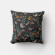 This throw pillow features hummingbirds, birds, butterflies, moths, ferns, mushrooms, and flowers on a dark blue background.