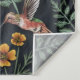 This tapestry features hummingbirds, birds, butterflies, moths, ferns, mushrooms, and flowers on a dark blue background.