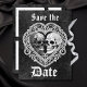 This save the date card postcard lets you celebrate your love of all things gothic and dark. The black and white graphic of two smiling lace filigree heart is perfect for a gothic or Halloween wedding. Created by Simply Farmhouse Press.