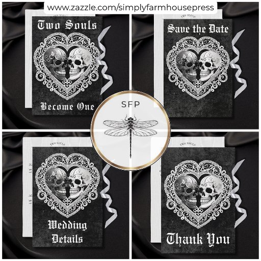 This save the date card card lets you celebrate your love of all things gothic and dark. The black and white graphic of two smiling lace filigree heart is perfect for a gothic or Halloween wedding. Created by Simply Farmhouse Press, it's part of the Dark Gothic Black & White Skull Couple Heart wedding suite.
