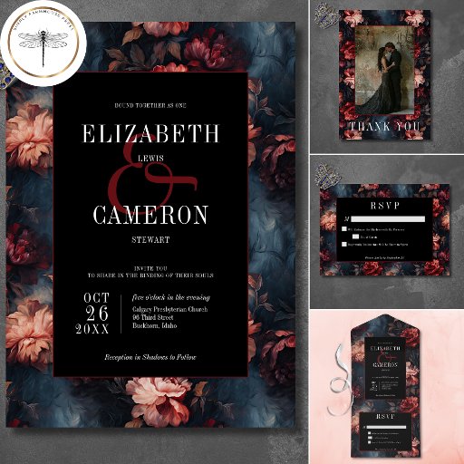 AVAILABLE WITH OR WITHOUT A QR CODE OR DINNER SELECTION OPTIONS. Elevate your wedding day to a level of dark, romantic enchantment with our Gothic-inspired wedding invitation. This exquisite design boasts a hauntingly beautiful vintage floral background, featuring deep red and soft blush pink flowers against a charcoal black canvas. This design captures the essence of Gothic allure, combining the rich, deep tones of red and the delicate blush of pink with the dramatic black backdrop, setting the perfect tone for a wedding that's as unique as your love story. Your guests will be spellbound by the mystical and captivating beauty of these invitations, making your wedding day a truly unforgettable journey through a world of dark, vintage romance. Choose this invitation to set the stage for a wedding that's both hauntingly beautiful and unforgettable. Created by Simply Farmhouse Press.