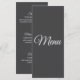 Elevate your reception dining experience with this elegant dark gray wedding menu card. Featuring a rich charcoal background paired with refined serif text and delicate script headings, this design presents each course with timeless sophistication.