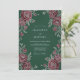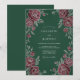 This design features a deep forest green backdrop that contrasts beautifully with rich burgundy roses. Delicate silver-toned leaves and botanical stems adorn the layout, creating a moody and sophisticated aesthetic for a formal winter affair. The lush floral arrangement includes open blooms and small buds for a refined look.