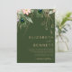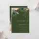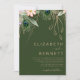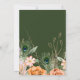 Dark peacock Feathers Wedding design with coral floral, deep blue teal peacock feathers and whimsical botanical lines on a dark forest green background.