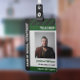 Vertical teacher ID badge personalised with photo, name, ID nr, department, and the year the badge is valid in a dark green design featuring a green plaid pattern as a small detail.