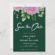 Dark Green watercolor pink roses with white handwritten font customisable "Save the Date" invitation. This design features beautiful pink roses and a large calligraphy style font which you can change to any other colour you like. You can also personalise all details and text colours on this Save the Date template.