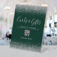 A chic, elegant sign to direct wedding guests to your cards and gifts table. The phrase "Card & Gifts" appears in silver grey handwriting calligraphy on a dark emerald green background. Add a QR code by entering your website URL to invite guests to contribute to your honeymoon fund. Silver faux glitter borders decorate the top and bottom edges.