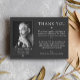 Minimalist and clean thank you card for a memorial service featuring white text against a plain dark grey background, tasteful fonts, and a photo of your loved one.