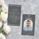 A dark grey background, a faux gold cross and an arch shaped frame for a photo. Personalise and add name, dates and your text and prayer. White text.