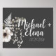 Modern wedding sign features watercolor white / neutral tones floral corner on poppy seed grey background with white customisable text blocks in modern fonts