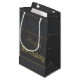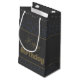 Small paper gift bag with handles, tote style with all over star print in silver grey taupe and blue. The dark grey background and stripe can be switched to any colour to coordinate with your style, and the happy birthday text can be personalised to suit any special occasion.