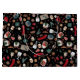 hygge christmas seamless pattern with cute and cosy christmas items on a black background. dark xmas wrapping paper with hand drawn pine trees, santa's socks, mittens, holiday candles, cookies, presents, candy canes, cinnamon, cloves, hot drink, homemade chocolate candies, apples, oranges. winter holiday repeating pattern.