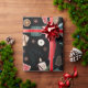 hygge christmas seamless pattern with cute and cosy christmas items on a black background. dark xmas wrapping paper with hand drawn pine trees, santa's socks, mittens, holiday candles, cookies, presents, candy canes, cinnamon, cloves, hot drink, homemade chocolate candies, apples, oranges. winter holiday repeating pattern.