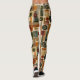 Sophisticated mid-century geometric pattern leggings featuring layered circles, arches, triangles, and rectangles in forest green, burnt orange, ochre, and cream on a black background. Rich textures and retro-modern shapes create a bold design ideal for Bauhaus lovers, vintage décor fans, and anyone drawn to moody modern style.