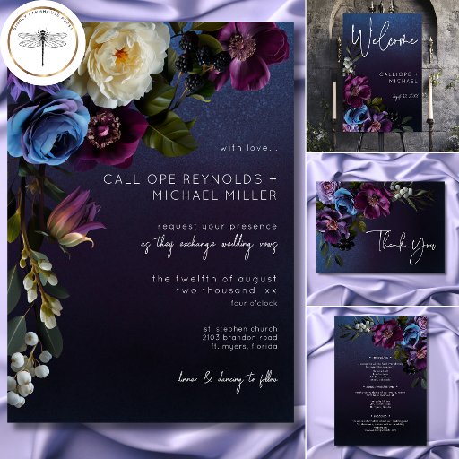 Dark Moody Blue Lavender Floral Modern Wedding Invitation