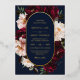Add a touch of luxury to your special day with this navy blue and burgundy floral wedding invitation featuring real gold foil accents. The design showcases rich watercolor florals — deep burgundy peonies, blush and ivory roses — framing a sophisticated oval layout on a deep navy background. The shimmering real gold foil details highlight your names and event information, creating a striking and elegant contrast that captures timeless romance and modern sophistication.