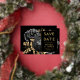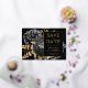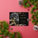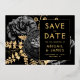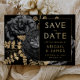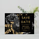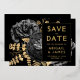 This elegant, moody wedding Save the Date card features a lush, romantic floral bouquet in black with gold faux foil and glitter foliage on a black background. Customise the real gold foil text in stylish fonts on a gold-bordered black rectangle, and add your wedding website URL to the solid black back.