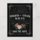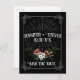 Set the tone for your wedding with this elegantly dark "Save the Date" card, designed for those who love a touch of mystery and romance. The rich black background provides a striking contrast to the delicate spiderweb centerpiece, framed by intricate vintage-style borders that add a timeless charm. Soft, muted florals in blush and earthy tones sit at the base, creating a balanced, ethereal aesthetic that feels both captivating and refined. This card is the perfect choice for couples seeking a unique, sophisticated design that stands out while embracing a subtly moody, enchanting vibe.