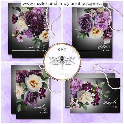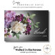 Unveil a touch of gothic romance with our captivating wedding thank you card. Immerse yourselves in a world of dark elegance as a stunning floral bouquet takes centre stage. Lush roses, hydrangeas, and other blooms in enchanting hues of mauve, purple, lilac, white, and cream are artfully arranged, surrounded by a soft, ethereal white halo against a backdrop of dramatic black. The bouquet is brought to life with the intricate details of rich green foliage. Your wedding details are presented in mysterious vintage fonts, adding to the invitation's allure. This enchanting suite is perfect for the couple seeking a touch of moody sophistication, ensuring a truly unforgettable beginning to your love story. Created by Simply Farmhouse Press.