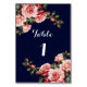 Dark moody pink and red roses navy blue wedding table number