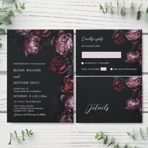 This elegant dark moody floral wedding invitation features purple and red peony flowers on a black background. Dark romantic aesthetic wedding invitation. With a scannable qr code and a custom photo on the backside.