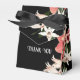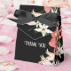 This favour bag brings a touch of elegance with a dark, sophisticated flair. The black background highlights soft florals in blush and white, while a simple “Thank You” message adds understated charm. Finished with a sleek black ribbon, it’s perfect for events with a refined, moody aesthetic.