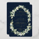 A dark navy reception only wedding invitation, featuring hand painted snowberries and stems of eucalyptus arranged into a beautiful botanical frame. The text and scattered dots on the front of the card are foil pressed. All text is fully editable. Please view this Collection in my store for invitations with alternative wording options, different colours and for coordinating items.