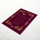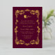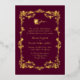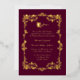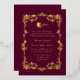 Ornate gold foil wedding invitation done in a dark orchid pink with gold rose vines framing the text area and a single long stem rose at the top of the text area. Personalise the foil text to suit your wedding needs.