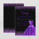 A beautiful dark purple themed elegant watercolor dress gown on a black background with faux glitter at the top and bottom of the rsvp.
