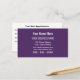 This modern professional appointment card is easy to personalise online before ordering. The front of the card features white text on a dark purple background. Should you need to change the dark purple to your company/brand colour, please scroll down in the personalisation template and click on “Edit using Design Tool” and adjust accordingly before ordering. The back of the appointment card features black text with black lines, arranged in a neat layout, with spaces for appointment date(s) and time(s) to be written by hand when the card is in use.