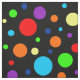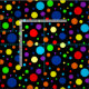A pattern of rainbow spots of different sizes on a dark background.