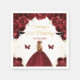 This elegant and glamourous birthday party napkin features a beautiful princess with blonde hair in a dark red ball gown. The text combines handwritten script and modern sans serif fonts for a classy and sophisticated look. The floral arrangements, butterfly and gold confetti create the perfect blend of rustic and chic.