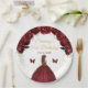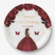 This elegant and glamourous birthday party plate features a beautiful princess with brunette hair in a dark red ball gown. The text combines handwritten script and modern sans serif fonts for a classy and sophisticated look. The floral arrangements, butterfly and gold confetti create the perfect blend of rustic and chic.