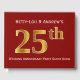 This guest book design features the ordinal number "25th" with a faux gold-like appearance. It also features custom names, and a dark red background. It could be used at a party for a married couple celebrating their twenty fifth wedding anniversary.