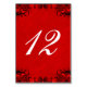 © Sunny Mars Designs - Floral Hibiscus: Dark Red on Red Vertical Wedding Table Number Cards - Stylish, modern, chic, trendy customisable custom printed wedding reception table number card with dark red, crimson, burgundy, ruby or maroon swirly tropical hibiscus floral design against a bright red background.