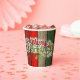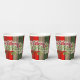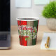 Beautiful, unique, classic, trendy, pretty and decorative Christmas holiday greeting paper cups with a classic Holiday dark red, forest green, and white coloured 'Merry Christmas' quote text on a rustic weathered wooden country cottage farmhouse style planks pattern background.