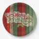 Beautiful, unique, classic, trendy, pretty and decorative Christmas holiday greeting paper plate with a classic Holiday dark red, forest green, and white coloured 'Merry Christmas' quote text on a rustic weathered wooden country cottage farmhouse style planks pattern background.