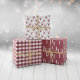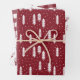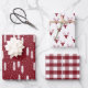 Rustic Christmas wrapping sheets with three matching patterns in white and dark red with a snowfall in the forest, deer heads, and plaid.
