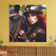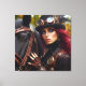 A stunning steampunk Art canvas of a Victorian Lady dark rider, with piercing blue eyes, red hair, goggles and top hat, stands tall beside her magnificent black horse in leather clothing with clockwork gears in a steampunk historical realm.