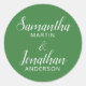 This round wedding sticker feature the name of the bride and groom in elegant handwritten calligraphy text. The background is dark sage green and can be changed to any colour by choosing customise.