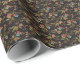 An Eastern European style floral pattern of red and blue flowers and green and brown leaves on a brownish black background on top, with an aged black-on-black aged stripe digital design on the bottom, overlaid by a ribbon and customisable monogram seal.