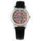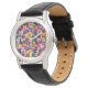 This women's watch has a geometric design of squares inside squares in brown, black, brick, yellow, teal, green, purple, gold, pink, red, grey on a field of lighter grey.