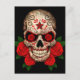 This unique design features a realistic Day of the Dead sugar skull. Four roses with leaves appear just behind the skull which sits on a pure black background. Dark swirls and dot patterns decorate the skull with a small five point star in the middle of the forehead. Two small roses sit inside of the sugar skull's eyes with round flower pedals surrounding them. A spider web sits on top of the skull in the tradition of sugar skull tattoos.