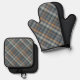 A modern pot holder or oven mitt featuring a tartan plaid pattern in shades of dark teal blue, tan, brown, beige, taupe, and ivory cream white. This stylish and chic accessory is perfect for any home cook, baker, or culinary expert.