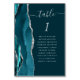 The left-hand edge of this elegant modern wedding table number card features a teal blue watercolor agate border trimmed with faux silver glitter. The word "table" appears in silver grey handwriting script on a dark teal blue background. Add the names of your guests who are assigned to each table.