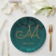 Dark teal green gold elegant fall wedding theme paper plates. Monogram floral pattern custom reception dinner decor. Classy, unique, chic, modern, trendy, stylish, succulent metallic. Beautiful typography. Image copyright Marg Seregelyi Photography.