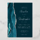 The left-hand edge of this elegant modern wedding invitation features a teal watercolor agate border trimmed with faux silver glitter. The customizable text combines real silver foil handwriting, copperplate and italic fonts on a dark teal blue background. The reverse side features a matching teal and silver agate design.