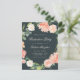 Floral graduation party invitations featuring watercolor peonies and roses in shades of blush pink and peach with beautiful eucalyptus greenery on a dark grey background.